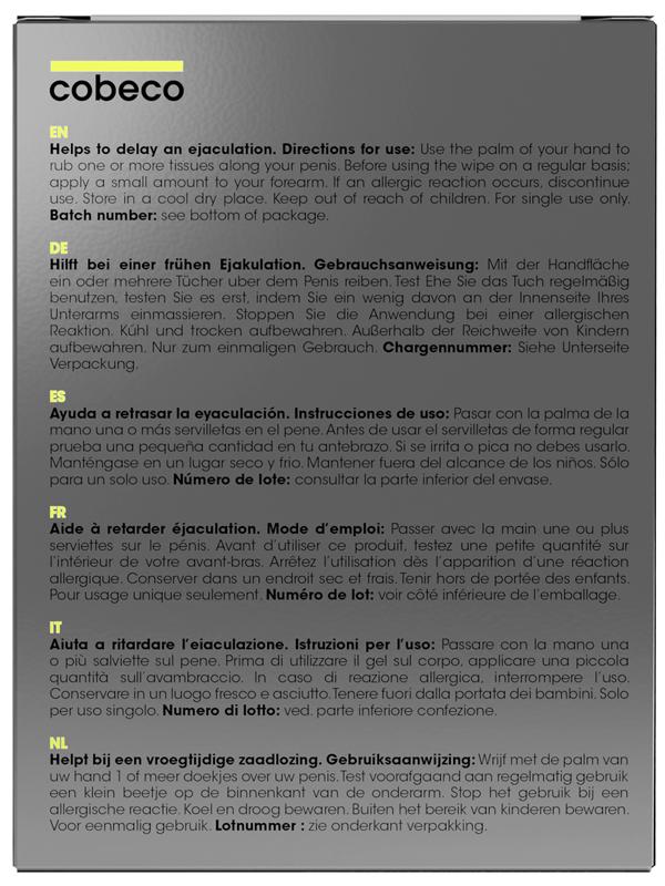 Le salviette sono confezionate singolarmente con la quantità ideale di MALE Cobeco Delay Spray, rendendolo facile da portare con te. Pertanto, sei sempre ben preparato per un'avventura lunga ed emozionante!